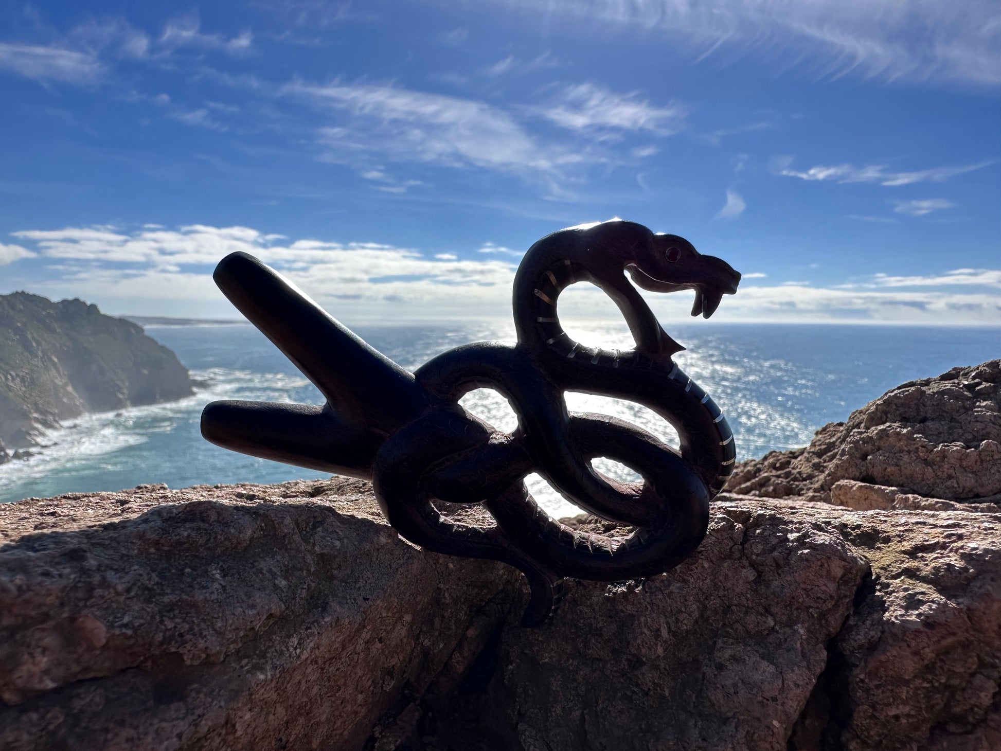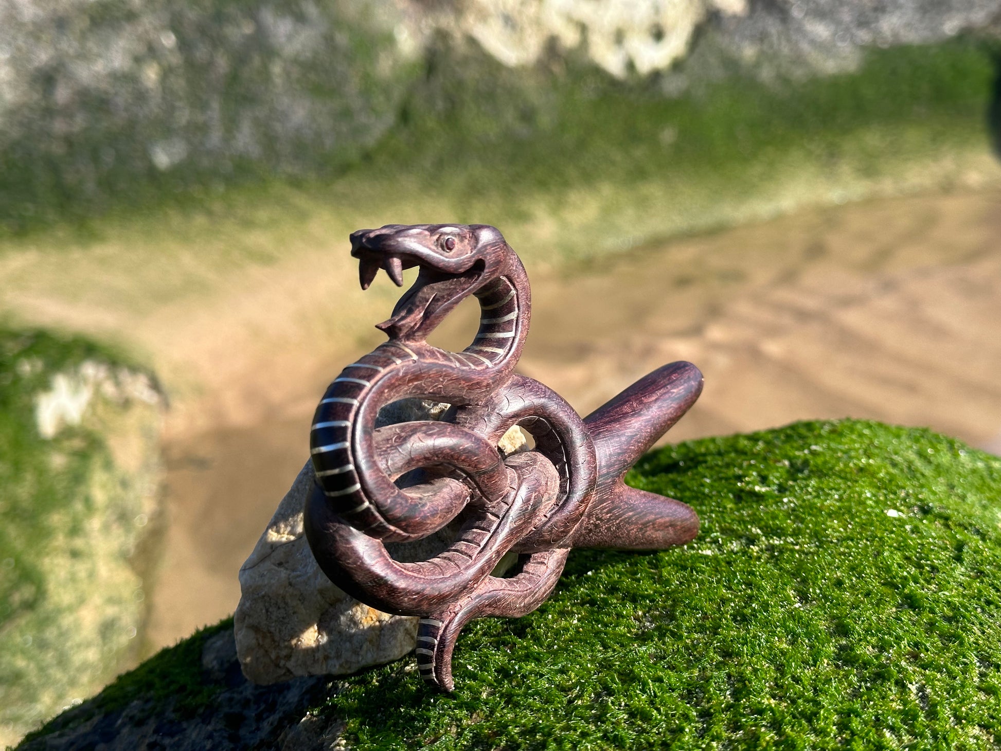 A magical design carved from a single block of wood shows the snakes wrapping around upon itself in many directions which represents the infinite and flexible nature of the snake. Carry this beautiful tool as a reminder of your ability to adapt and overcome!